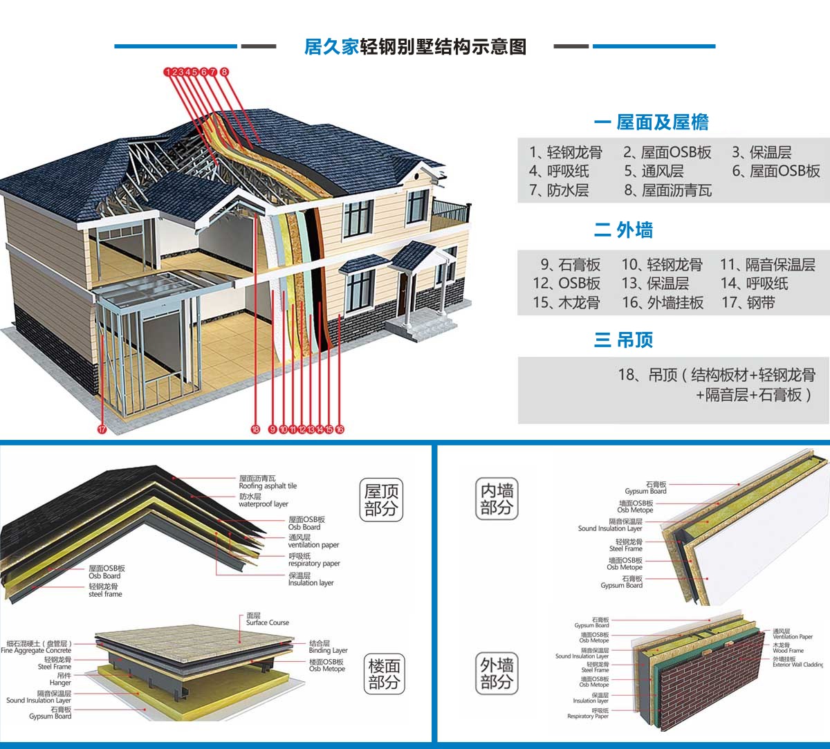 居久家輕鋼別墅隸屬于四川萬建城建筑工程有限公司,集科研、設(shè)計(jì)、咨詢、加工、生產(chǎn)安裝為一體。一直致力于新型輕鋼結(jié)構(gòu)房屋的研究、開發(fā)和應(yīng)用,倡導(dǎo)房屋建筑的設(shè)計(jì)和應(yīng)用在標(biāo)準(zhǔn)化、模塊化、通用化、規(guī)?;a(chǎn)的同時(shí),實(shí)現(xiàn)人居環(huán)境的個(gè)性化、人性化、以及健康和舒適。 公司目前引進(jìn)具有國內(nèi)先進(jìn)水平輕鋼結(jié)構(gòu)房屋建筑技術(shù)和生產(chǎn)線,標(biāo)準(zhǔn)化、精細(xì)化和定制化設(shè)計(jì)、制造、安裝輕鋼結(jié)構(gòu)房屋。不僅能夠提供風(fēng)格各異的別墅建筑,同樣能夠提供行業(yè)標(biāo)準(zhǔn)的輕鋼樓宇建筑及建筑群。居久家裝配式房屋技術(shù)體系是高效節(jié)能型綠色建筑體系,各項(xiàng)建筑物理性能卓越,處于業(yè)內(nèi)先進(jìn)水平,能夠?yàn)榭蛻籼峁┤棠K化綠色建筑集成解決方案。